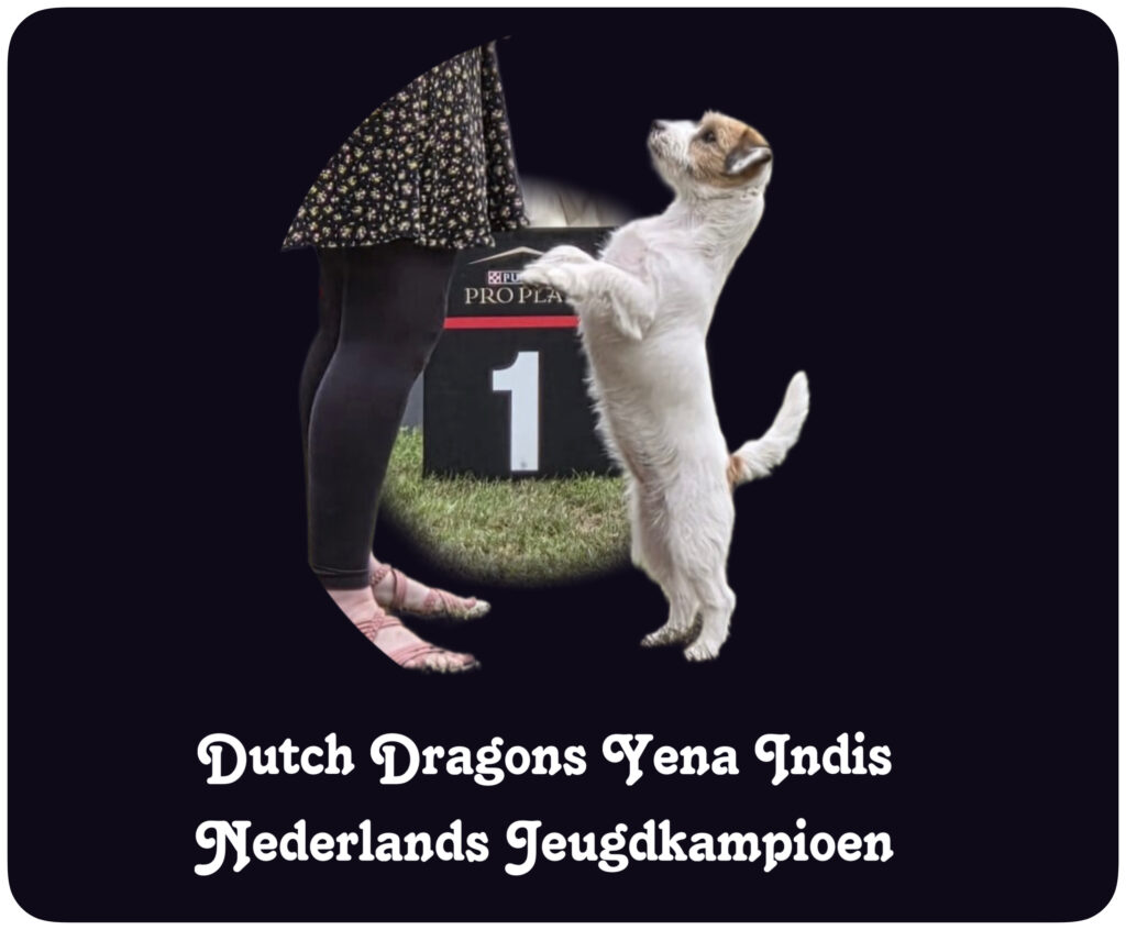 Uitslagen Uitslagen NVJRT Kampioenschapsclubmtach 2025, Arnhem 5 oktober 2025 Dutch Dragons Yena Indis Keurmeester: Marcus Werths (DE)Klasse: JeugdUitslag: 2U (van 15) International Dog Show, Maastricht 27 september 2025 Dutch Dragons Yena Indis Keurmeester: Vladimír Piskay (Slovakia)Klasse: JeugdUitslag: 2U HRV Halloween Show 20 september 2025 Dutch Dragons Yena Indis Keurmeester: Dusan Paunovic (SERVIE)Klasse: JeugdUitslag: 1UBeste jeugdteefBOSBelgisch Jeugdkampioen Brabo Open, Brasschaat 9 september 2025 Dutch Dragons Yena Indis Keurmeester: Gail Patterson (IE)Klasse: JeugdUitslag: 1UBeste jeugdteefBOS Dogshow Rotterdam 17 augustus 2025 Dutch Dragons Yena Indis Keurmeester: Claudia Crezee-Nigro (NL)Klasse: JeugdUitslag: 1UReserve Beste TeefReserve CAC Brabants Rashondenfestival 13 juli 2025 Dutch Dragons Yena Indis Keurmeester: Tatjane urek-Jipping (NL)Klasse: JeugdUitslag: 1UBOS JeugdNederlands Jeugdkampioen Show der Kempen 5 juli 2025 Dutch Dragons Yena Indis Keurmeester: John Wauben (NL)Klasse: JeugdUitslag: 3ZG LKV Genk 28 juni 2025 Dutch Dragons Yena Indis Keurmeester: Igor Selimović (Croatie)Klasse: JeugdUitslag: 1UBOS JeugdFCI-CACIB-J Dogshow Eindhoven 21 juni 2025 Dutch Dragons Yena Indis Keurmeester: Theo Van Der Horst (NL)Klasse: JeugdUitslag: 1U Kampioenschapsclubmatch Jack Russell VriendenNieuwegein 15 juni 2025 Dutch Dragons Yena Indis Keurmeester: Gerda van Stuivenberg-Bulters (NL)Klasse: JeugdUitslag: 1UReserve Beste TeefReserve CAC Internationale 50ste Pinkstershow Gorinchem 9 juni 2025 Dutch Dragons Yena Indis Keurmeester: Chantal Kok-van der Horst (NL)Klasse: JeugdUitslag: 2ZG DOGS & FUN - International Show + Europasieger with Crufts Q 23 & 24 mei 2025 Dutch Dragons Yena Indis Keurmeester: Morgan Granander (SE)Klasse: JeugdUitslag: 3U Keurmeester: Tina Toft Bergstrøm (DK)Klasse: JeugdUitslag: 3ZG Internationale Dogshow OSS 18 mei 2025 Dutch Dragons Yena Indis Keurmeester: John Wauben (NL)Klasse: JeugdUitslag: 3U Dogshow Antwerpen 5 april 2025 Dutch Dragons Yena Indis Keurmeester: Vojislav Al Daghistani (RU) Klasse: PuppyUitslag: 1VBBeste Puppy teef 49ste Schaal Der Kempen 23 maart 2025 Dutch Dragons Yena Indis Keurmeester: Boris Spoljaric (HR) Klasse: PuppyUitslag: 1VBBeste Puppy Internatonal DogShow Rijnland 16 maart 2025 Dutch Dragons Yena Indis Keurmeester: Hannie Warendorf (NL) Klasse: PuppyUitslag: 1VBBeste PuppyRijnland Puppy Diamant 2025 Genk HKV - 27th Ambiorixtrofee 11 januari 2025 Dutch Dragons Yena Indis Keurmeester: Korózs-Papp Judit (Hungary)Klasse: Minor PuppyUitslag: 1VB Brussels Dogshow 133 & 134 15 december 2024 Dutch Dragons Yena Indis Keurmeester: Dhr. Matakovic Bojan (Croatia)Klasse: Minor PuppyUitslag:1VBBest Minor Puppy Keurmeester: Dhr. Jean-Francois Vanaken (BE)Klasse: Minor PuppyUitslag: 1VBBest Minor Puppy Kerstshow, Gorinchem 8 december 2024 Dutch Dragons Yena Indis Keurmeester: Mw. Elly Weggemans (NL)Keurmeester Erering: Mw. Susan MogonyKlasse: Minor PuppyUitslag: 1VBBest Minor Puppy BIS Minor Puppy Pinkstershow, Gorinchem 19-05-2024 Rapparee Rose's Ivy Keurmeester: Mw. Jos Dekker (NL)Klasse: TussenUitslag: 1ZG 2e Jonge Honden & Veteranen dag 05-05-2024 Rapparee Rose's Ivy Keurmeester: Mw. R. Liebrand & Mw. J. Broeksteeg (NL)Klasse: TussenUitslag: 1-4 International Dogshow Rijnland 13-04-2024 Rapparee Rose's Ivy Keurmeester: Mw. Elly Weggemans (NL)Klasse: TussenUitslag: 2U Ambiorixtrofee Genk 13-01-2024 Rapparee Rose's Ivy Keurmeester: Mw. Elly Weggemans (NL)Klasse: TussenUitslag: 2U Reserve Beste TeefReserve CAC Brussels 129st & 130st DogShow 17-12-2023 Rapparee Rose's Ivy Keurrmeester: Dhr. Mate Duran Enrique (ES)Klasse: TussenUitslag: 1 U, Dubbel CACTitel: Belgian Winner Keurmeester: Dhr. Gatica Mariano Hernan (CL)Klasse: TussenUitslag: 1 U, Dubbel CAC KerstShow, Gorinchem 09-12-2023 Rapparee Rose's Ivy Keurmeester: Mw. Anita van Bussel (NL)Klasse: TussenUitslag: 1 U NVJRT Kampioensclubmatch 01-10-2023 Rapparee Rose's Ivy Keurmeester: Dhr. Hans van de Berg (NL)Klasse: JeugdUitslag: 4ZG Zwolle Outdoor IV 09-09-2023 Rapparee Rose's Ivy Keurmeester: Mw. Mieke Jansen-Kalshoven (NL)Klasse: JeugdUitslag: 1U Dogshow Rotterdam, Bergschenhoek 05-08-2023 Rapparee Rose's Ivy Keurmeester: Mr. Svante Frisk (SE)Klasse: JeugdUitslag: 2U Pinkstershow, Gorinchem 29-05-2023 Rapparee Rose's Ivy Keurmeester: Mw. Elly Weggemans (NL)Klasse: JeugdUitslag: 3ZG Jonge Hondendag, Nijmegen 07-05-2023 Rapparee Rose's Ivy Keurmeester: Mw. L. van Waardenburg & Mw. Anita van BusselKlasse: JeugdUitslag: 2ᵉ & 3ᵉ Dogshow Oss, 's-Hertogenbosch 30-04-2023 Rapparee Rose's Ivy Keurmeester: Mr. Hans-Erhard Grüttner (DE)Klasse: JeugdUitslag: 3U Holland Cup, Rijnland 18-03-2023 Rapparee Rose's Ivy Keurmeester: Mr. Walter Jungblut (DE)Klasse: JeugdUitslag: ZG Kerstshow, Gorinchem 17-12-2022 Rapparee Rose's Ivy Keurmeester: Mr. François Graulus (BE)Klasse: PuppyUitslag: 1B, Beste Puppy Teef